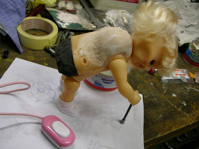 Ich bekam die Aufgabe, Batteriepuppen so umzugestalten, dass sie aussahen wie hinfällige Betagte. Es ging darum, dass die Leute daran gehindert werden sollten, altes Batteriespielzeug einfach wegzuwerfen, mitsamt den abgelaufenen Batterien darin. Die sollten herausgenommen und in eine Sammelstelle gebracht werden. Ein Bäbi, der Trommel-Hase und ein Roboter mussten gealtert werden.