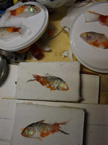 Ich bekam gestorbene Goldfische aus Zierfischläden, um eine Silikon-Giessform machen zu können.