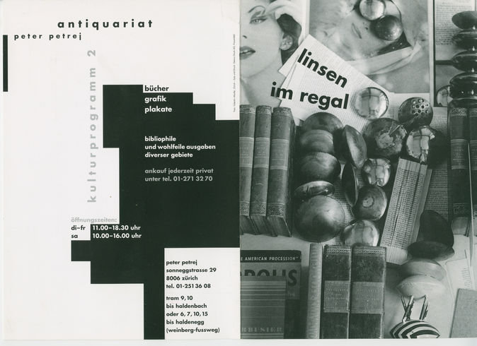 Peter Petrej https://www.buch-antiquariat.ch/ bot mir an, in seinem Antiquariat eine Ausstellung zu machen. Leider hatte ich vergessen, auf der Einladungskarte die Jahreszahl zu drucken: Darum vermute ich bloss, dass das etwa 1992 war..