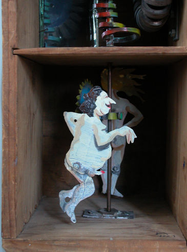 1991 baute ich für Ursula Bänninger auf Bestellung die dritte Türklingel.. Wie bei der zweiten nahm ich ein altes kleines Holzregal und füllte es mit bemalten Blechfiguren, die sich bewegten, wenn der Motor Strom bekam.